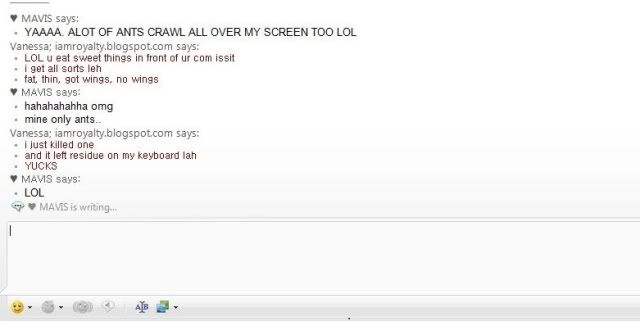 I vented out my frustration for bugs crawling on my notebook's screen on my msn personal message yesterday night, then something happened which made me laugh until so peng that I just had to print screen it.